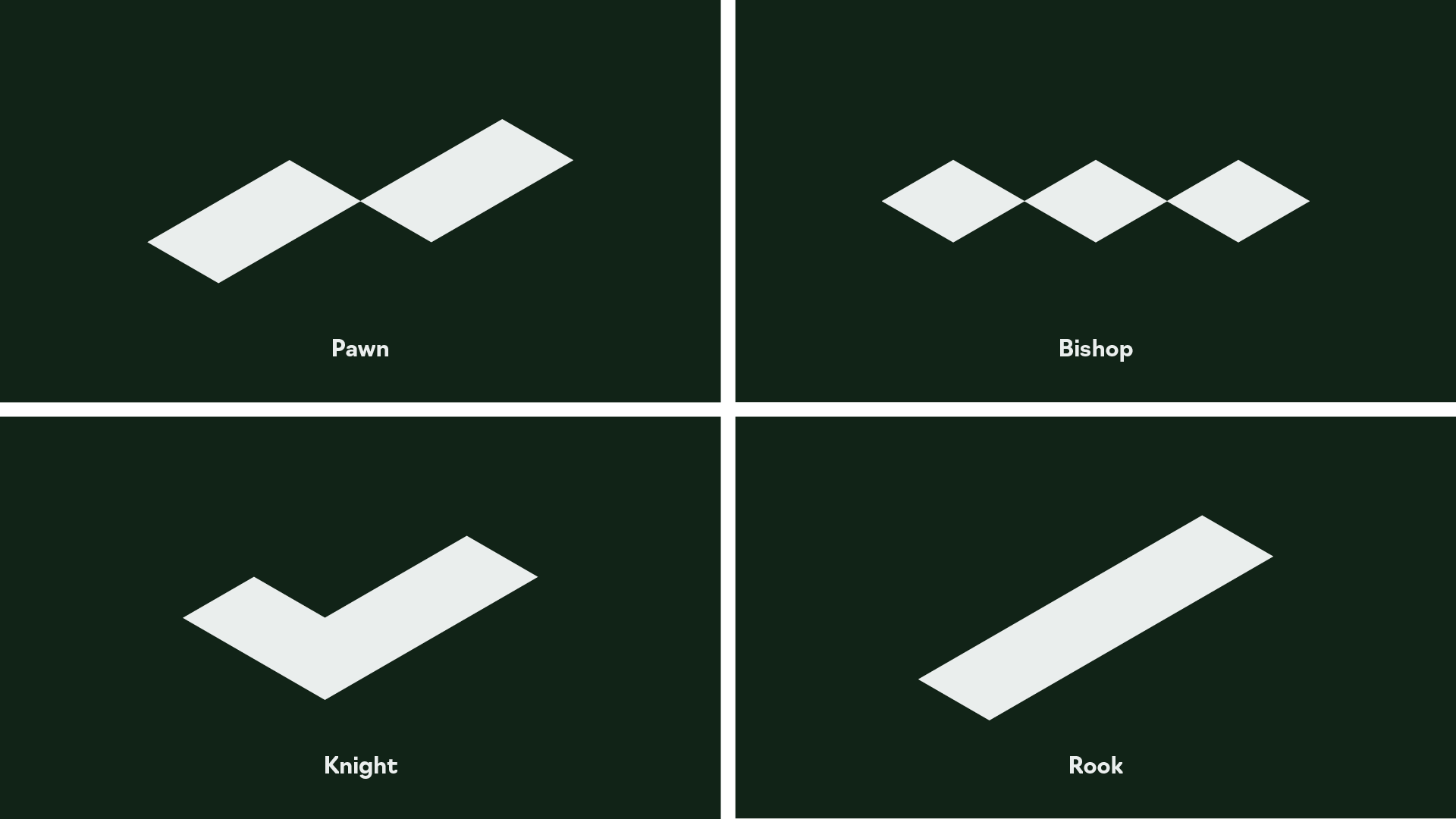 The chess icons are designed on an isometric grid like the logo, but the shape is based on the standard chess set used for competitive matches to distinguish each piece in fast playing blitz matches.